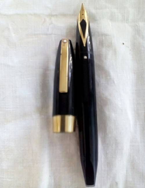 Sheaffer Legacy fountain pen. Black with gold trim. 14ct gold nib. White dot to clip. Measures 130mm in length. Good condition.