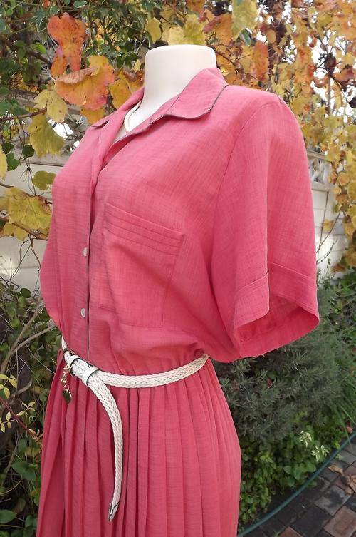 Sheer polyester coral short sleeve dress with permanent pleated skirt.Size 40/16.Elasticated middle.