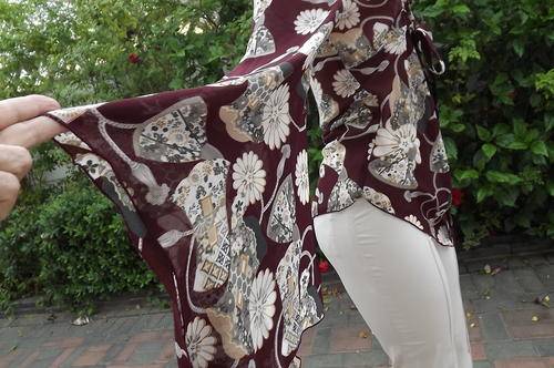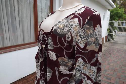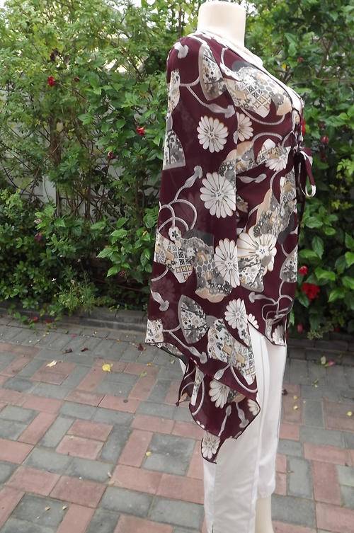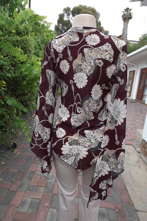 Sheer polyester top by Identity. Fabulous sleeves. Size 32/8. Maroon and beige patterned. Smockwork on front with straps to tie. Pointed seams. New condition