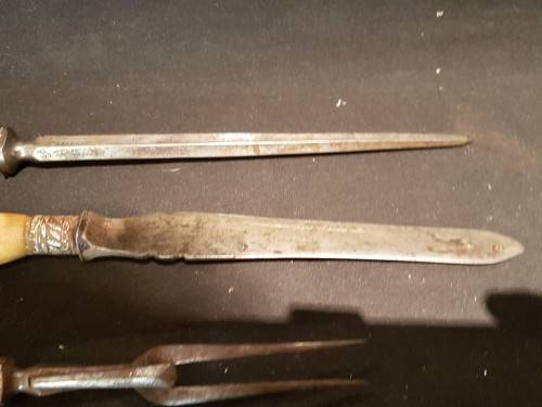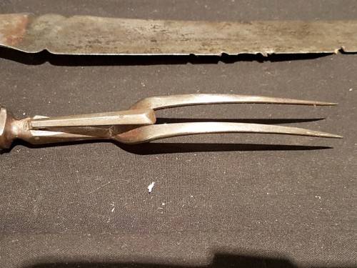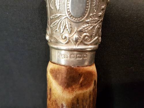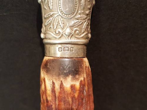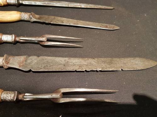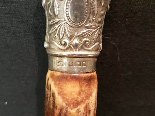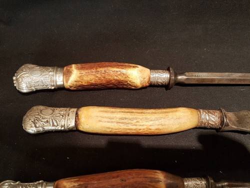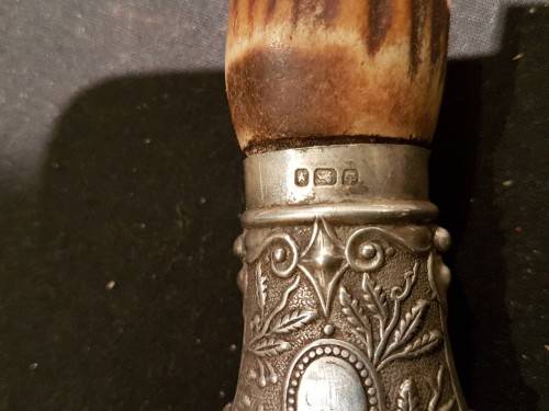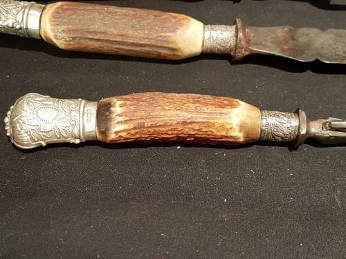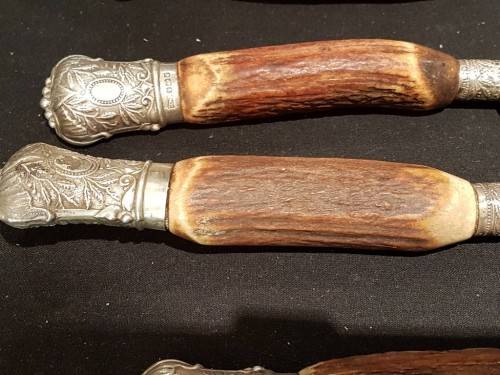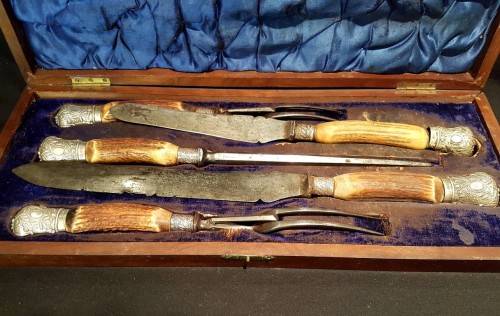 A stunning vintage serving set! These old beauties have a silver hallmark "JEH" My research could not find it but it is English, early 1900's. They are all antler handled and the condition vary from fair to poor in the case of the knife. Conditions as per photo's. The set comes in a wooden case with a brass locket. The carving forks measure 28cm and 29cm respectively and the carving knifes measure 33.5cm and 41cm respectively. The 5th piece measures 35cm. Note the condition of the one knife. Act fast and bid now at this low price!