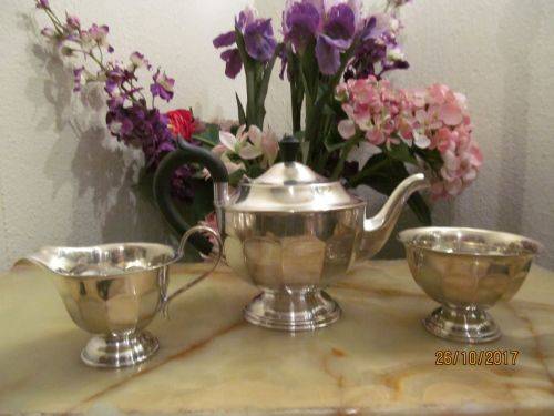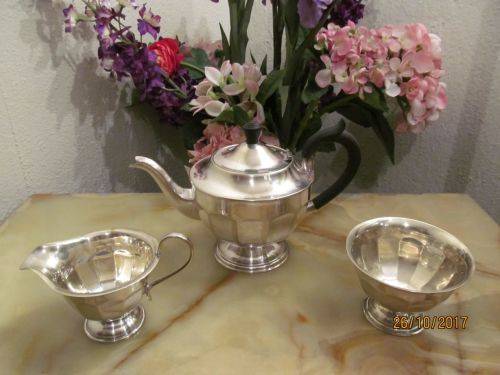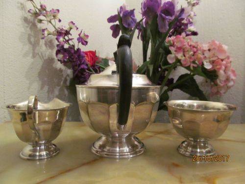 A SUPER GORGEOUS THREE PIECE SILVER PLATED TEA SET WHICH ONE CAN ALMOST CONSIDER ANTIQUE SINCE ITS DATE OF MANUFACTURE WAS DURING THE 1920's