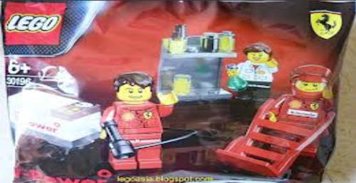 SHELL FARRARI LEGO CAR FULL SET 6 OF 6 CARS and Ferrari Team Pit Crew/ Mini Figures