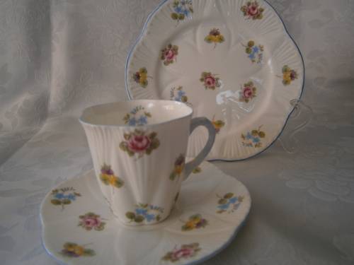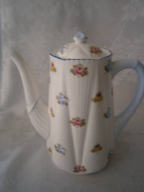 22 pieces: Coffee pot, milk jug, sugar bowl, 6 cups, 6 saucers, 6 side plates, Cake plate.