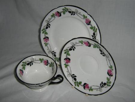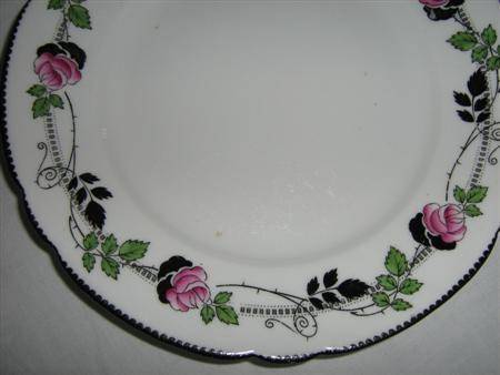 THE NAME OF THE PATTERN IS NOT AVAILABLE, BUT THE BLACK & RED FLOWER ON ENTWINED GREEN AND BLACK FOLIAGE IS MOST ATTRACTIVE....ON A BACKGROUND OF SNOW WHITE PORCELAIN WITH A SCOLLOPED BLACK RIM.....