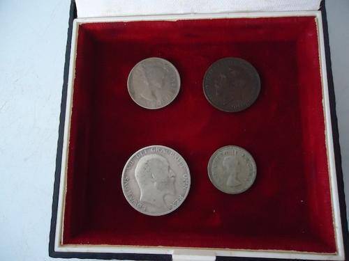 ONE SHILLING - EDWARD VII - 1906 & FARTHING - GEORGE V - 1919 & TICKY - QUEEN ELIZABETH - 1957 AND SIXPENCE - QUEEN ELIZABETH II - 1967. SILVER & BRONZE COINS, BID FOR ALL AS ONE LOT. SOOO VERY COLLECTIBLE!!