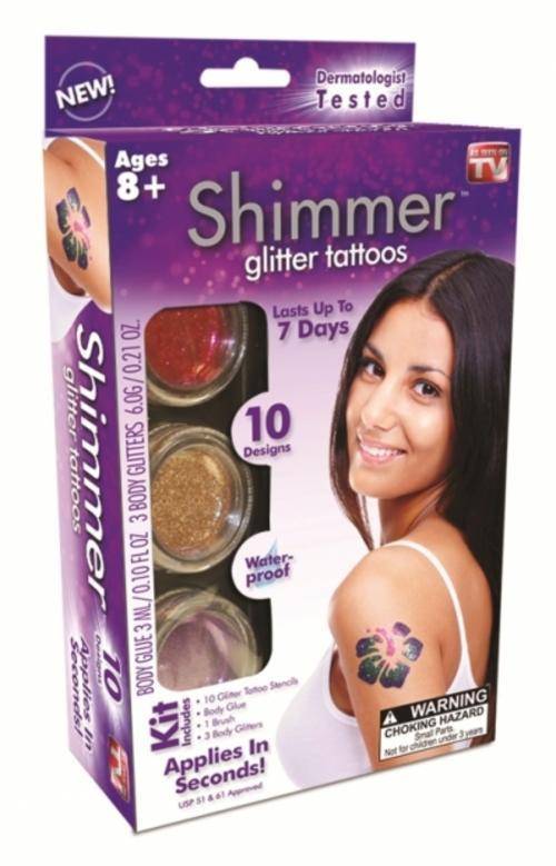 Shimmer Glitter Tattoos As Seen on TV make it easy to create professional looking tattoos in just a few simple steps! Simply press on the stencil, brush on the adhesive, remove the stencil, and brush on glitter- now marvel at your beautiful art work. You can use Shimmer Glitter Tattoos anywhere...arms, back, face, really anywhere! Shimmer Glitter Tattoos are water proof and last up to 7 days. Shimmer body art is perfect for parties, sleepovers, sporting events, or just for something fun to do. Shimmer removes easily with baby oil.