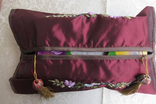 Shiny mahogany colour satin padded tissue box cover with tussel at each side.New.
