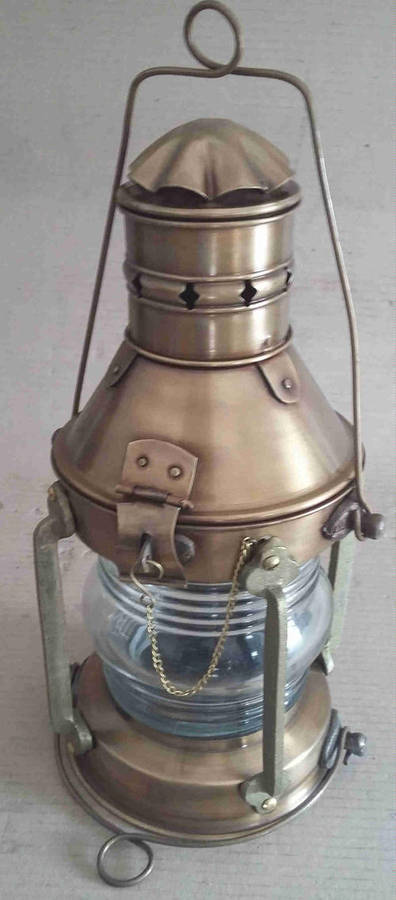 Ship anchor lamp. brass, has oil burner. 33cm high x 16cm wide. Postage SA post office R68.00, courier R94.00 to most main centres.