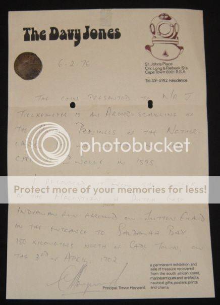 This coin comes with its original Certificate of Authenticity signed by the Principal Diver on the wreck in 1976 (Trevor Hayward).