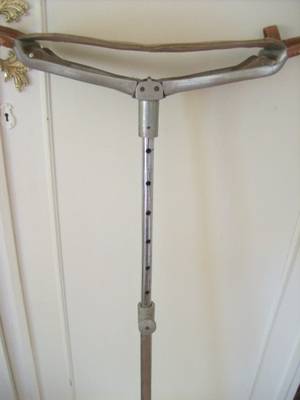 Adjustable shooting stick, this stick is completely able to be shortened or lengthened to the hight that is desirable, when folded up to its shortest lerngth it is 680mm long with a leather toggle to fasten the handls together, fully extended by means of a knurled knob it is 940mm long & 3 with the seat open it is 780 mm high, apart from a little rust on the main tubuler pole it is in good condition.