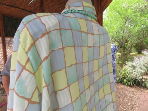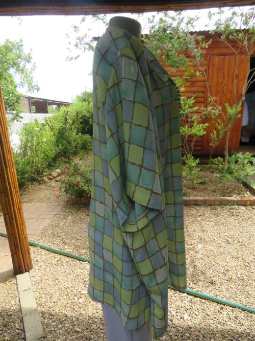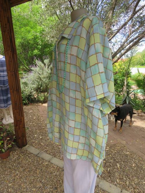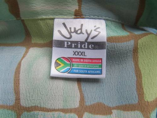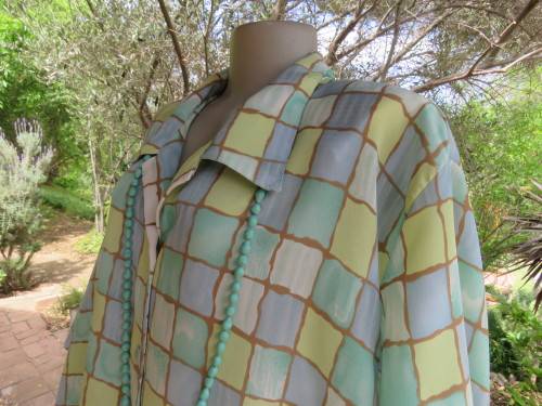 Short sleeve JUDY'S PRIDE button down top in blue and green small colour blocks.Size 54/30