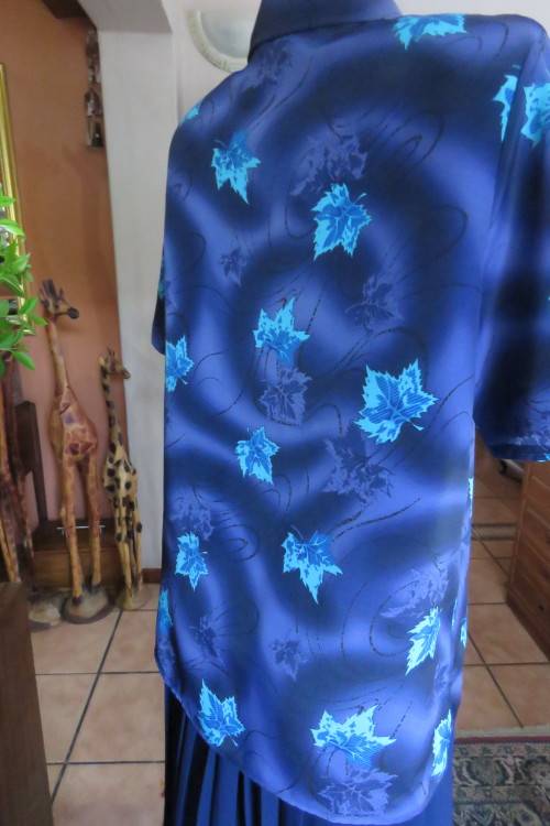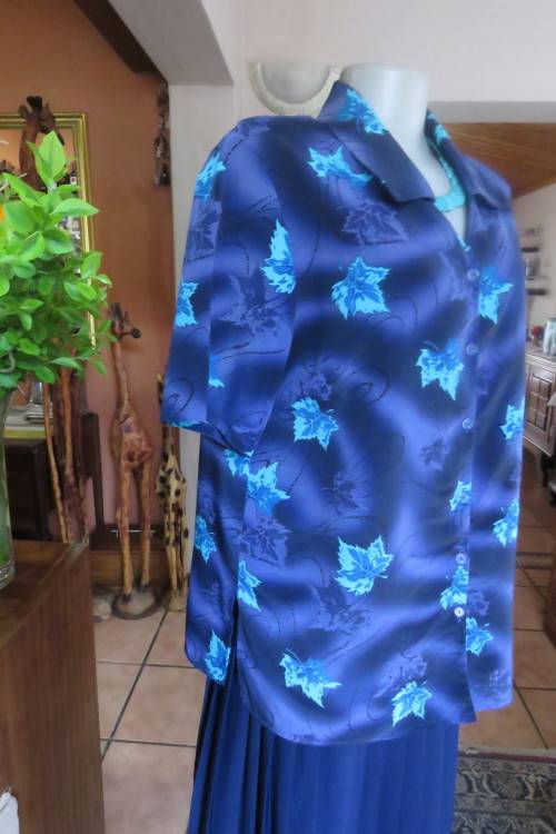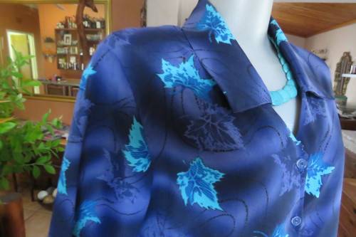 Short sleeve summer blouse in medley of blues with turquoise leaves.Size 40/16.Button down front with V and Johnny collar.In 100% polyester fabric.Good cond.