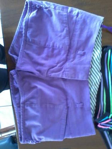 3 pairs of shorts size 10 (34). 1 pair black looks grey on picture due to too much light, one purple, one stripes with black edging-unworn.