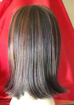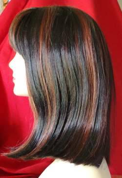 Stylishly shoulder length "BOB cut" dark brown wig with copper/red hi-lights.