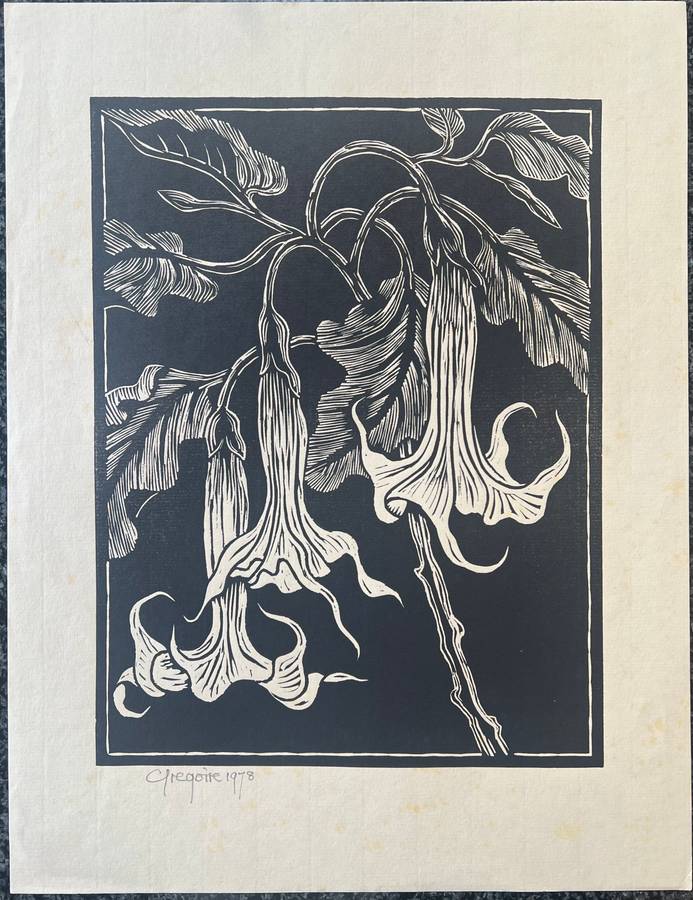 GREGOIRE BOONZAIER LINOCUT "MAANBLOMME". SIGNED BY GREGOIRE BOONZAIER, DATED 1978. IDEAL FOR COLLECTORS, INTERIOR DECORATORS. SUITABLE FOR FRAMING. IN GOOD CONDITION WITH LIGHT FOXING AS SHOWN IN PICTURES. MEASUREMENTS: 40.5CM x 31CM. PLEASE CHECK THE PICTURES CAREFULLY FOR CONDITION.