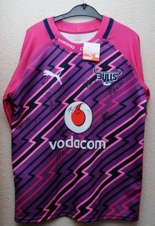 You are bidding on a Signed Blue Bulls Super 15 Away Jersey from the 2012 Season. The jersey still has the original Puma tag attached and has never been worn. The Pink Away Jersey has become the symbol for the Bulls' 2012 season and is a must for any collector.