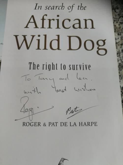 SIGNED BY BOTH AUTHORS ; IN SEARCH OF THE AFRICAN WILD DOG ; ROGER and PAT DE LA HARPE ; ; Hardcover ; Sunbird Publishers ; First Published ; 2009 ; Sponsored by SASOL ; No. of Pages ; 160 wildlife photography ; includes ; Makanyane Tswana North West Bushveld ; Mathalerwa Venda / Tswana Limpopo Valley ; Amankentshane - Zululand ; Mahlolwa Shangaan - Greater Kruger National Park Condition of book including the dust jacket ; very ( very ) good ; very good binding ; very clean ; only writing is the signatures of bot Roger and Pat De La Harpe . From Goodreads ; "Arguable the most successful hunter in Africa, the African wild dog, ironically finds itself on the brink of extinction. Part of the Canidae family, and sharing a general similarity with the various canids worldwide, the African wild dog differs fundamentally from other canids: it belongs to the genus, Lycaon, which formed a new branch on the family tree some 3 million years back and subsequently evolved independently. Today it is the only survivor of this unique line and, because of its genetic difference, is unable to interbreed with any of its canid relatives or even with the domestic dog. Previously found in diverse habitats across the continent, it has tragically disappeared from much of its former range. Today there are only an estimated 3,000 to 5,500 wild dogs left in the whole of Africa, a mere 500 of which occur in South Africa.In spite of, or perhaps because of, the elusive nature of the wild dogs and their limited population numbers, Roger and Pat have produced their best book yet."