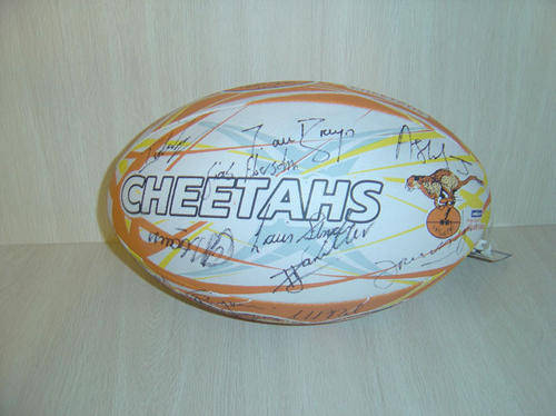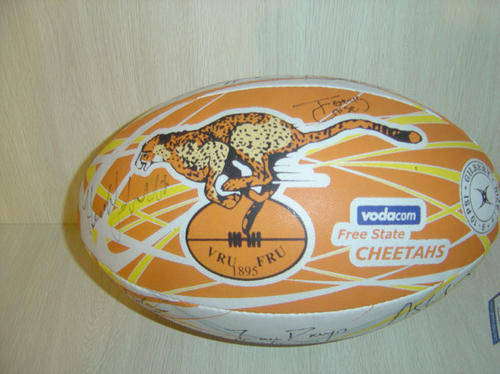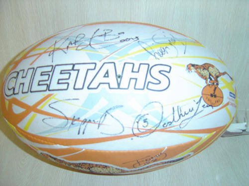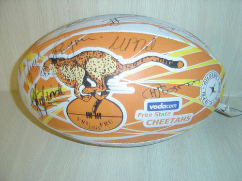 Up for auction is Gilbert Vodacom Free State Cheetahs Rugby Ball signed by the players who will be playing in the Semifinal against Western Province on Saturday. Don't write the Cheetahs off!!! Look what happend to the Sharks last year. The Cheetahs beat them on their own backyard to reach the final!! What if the Cheetahs reach the final and win it? You might end up bidding on a nice piece of Memorabillia !!!! So come on and Bid!! The starting price is low!!