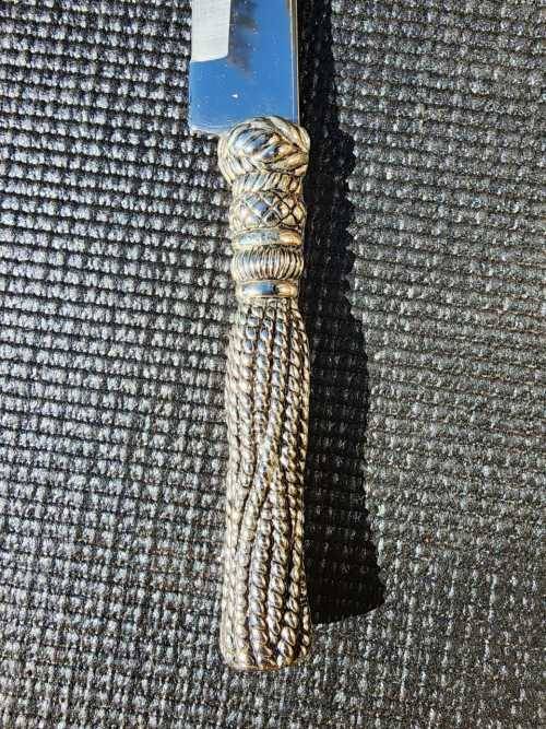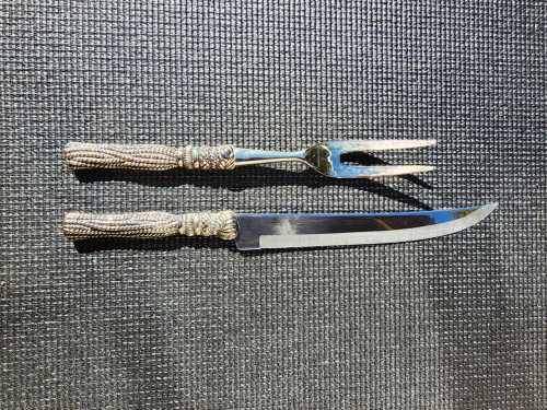 A BEAUTIFUL AND UNIQUE CARVING SET, PROBABLY FROM THE 1970S, AND MADE BY THE FRENCH COMPANY SILEA. IT HAS AN UNUSUAL DESIGNER TASSEL PATTERN WHICH SHOWS AN ELABORATE ROPE TASSEL ON EACH HANDLE.