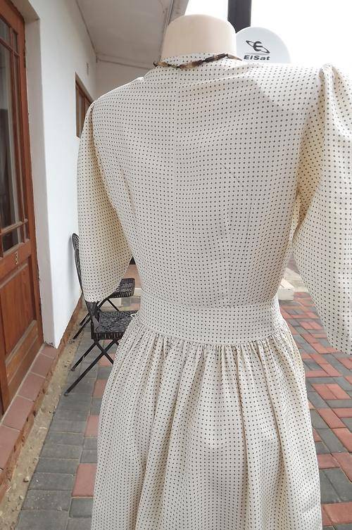 Silk cream dress with brown dots by Cordier in size 33/9.Gathered in middle with wide skirt.V-button down bodice.Short sleeves.Excellent French make-Fabric can be silk.Used but in good condition