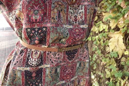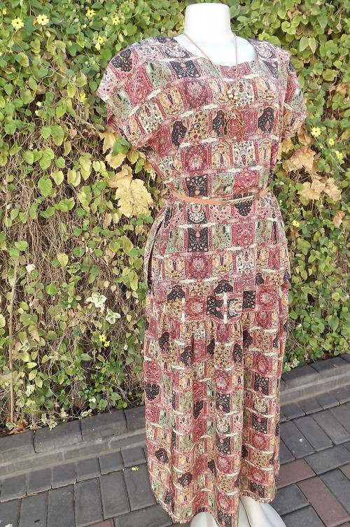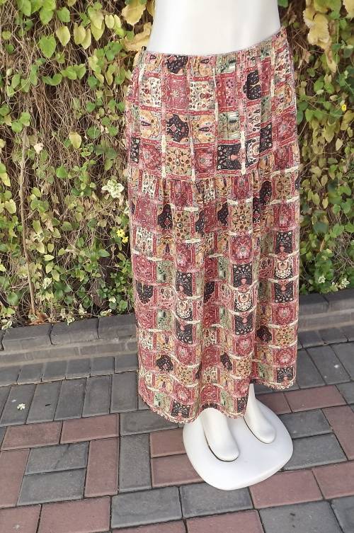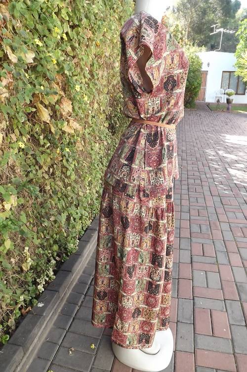 Silky polyester 2 piece outfit in a baroque pattern.Boutique made size 37/13.Yoked skirt.Elasticated middle.Gathered.Can wear with or without included belt.As new.