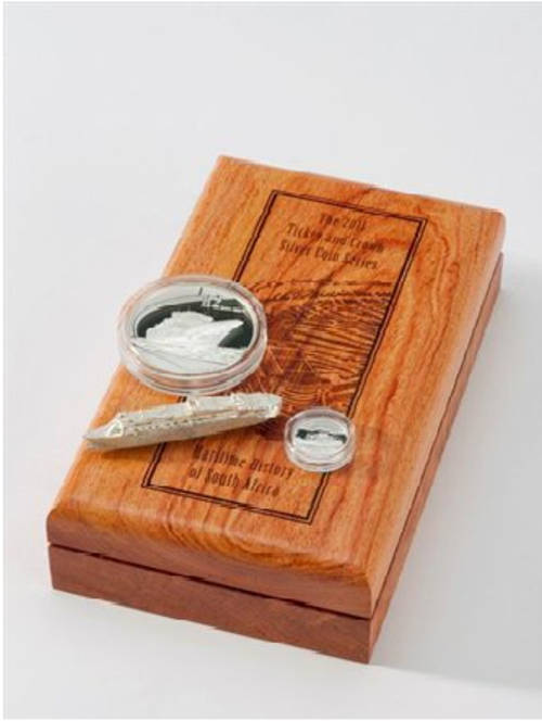 The 2011 Silver Combination set includes the Silver Crown and Silver Tickey and forms part of the Maritime History of South Africa series. The Crown depicts the RMS Queen Mary 2 and the Tickey the S.A.van der Stel. The set includes a small ship figurine.