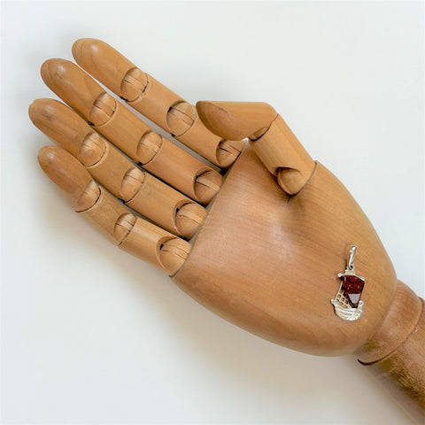 The modern silver pendant has a small fixed loop and a hinged wedge-shaped bale. It is in the form of a sailing ship with an attached curved triangular amber sail (11.5mm x 9.5mm; dark orange). The pendant is marked "925".
