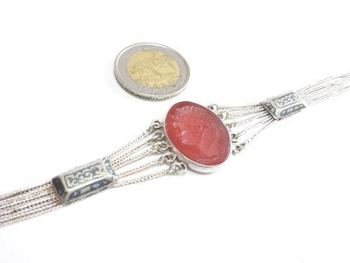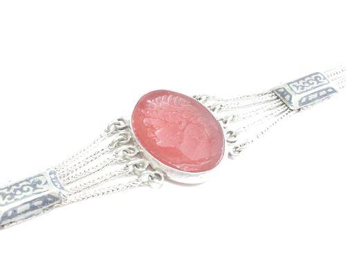 I am not 100 % sure what the cameo is made of feels looks and feels like a stone but not 100 % sure