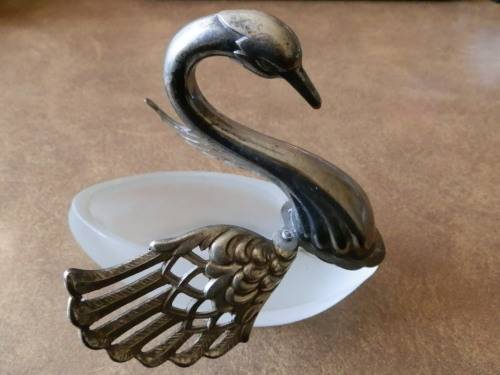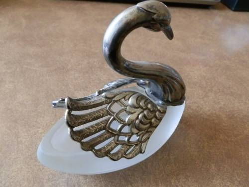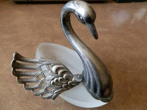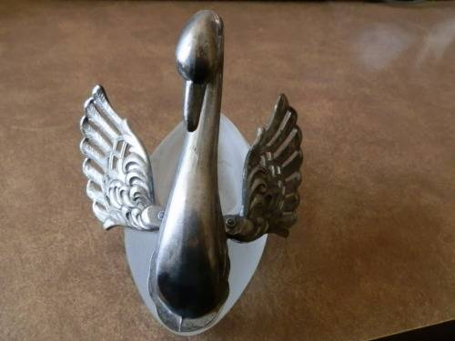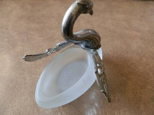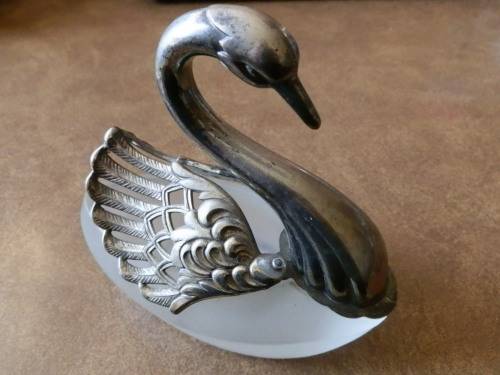 Silver and frosted glass swan with movable wings, no markings and in good for age condition, no cracks or chips to the glass, the silver plating shows wear. The size is 3 cm (w) x 14.5 cm (l) x 13.5 cm (h).