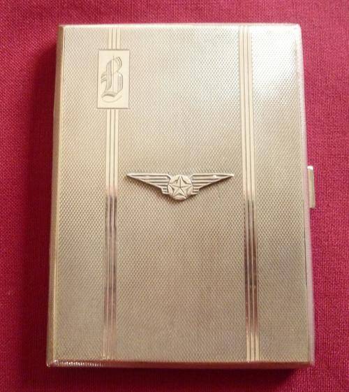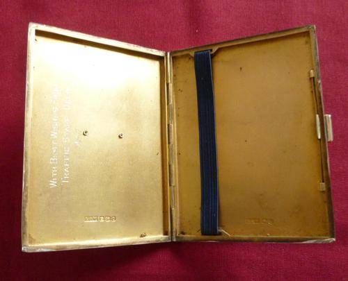 A large silver cigarette case with machine engraving, monogrammed B and with an emblem for the Delhi police on the front. The case measures 11cm by 8cm, weighs a substantial 152 grams and was assayed in Sheffield in 1945. Inside is engraved With best wishes from the traffic staff Delhi 1947. The case is in good condition, some scratches don't detract.