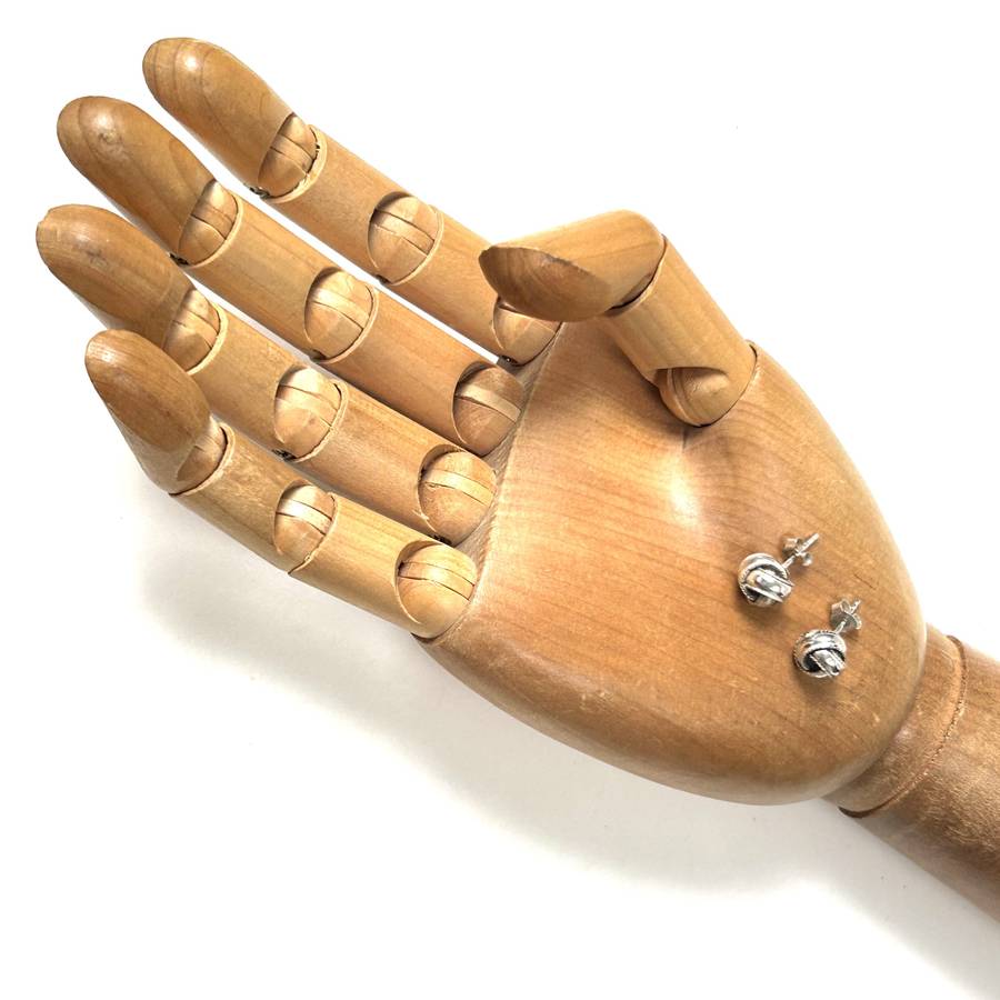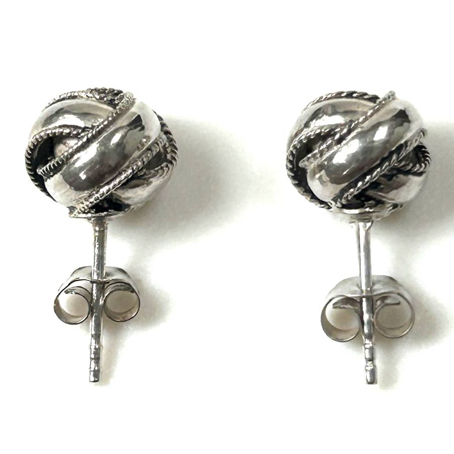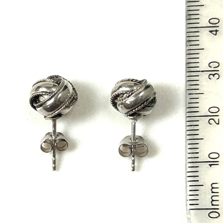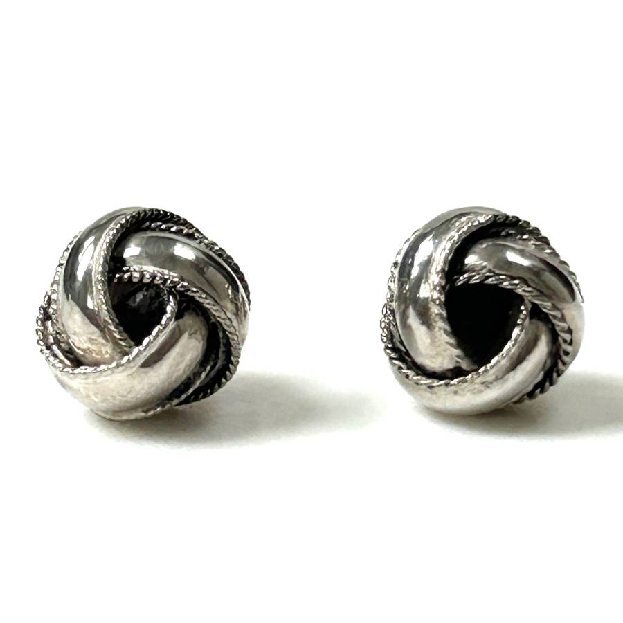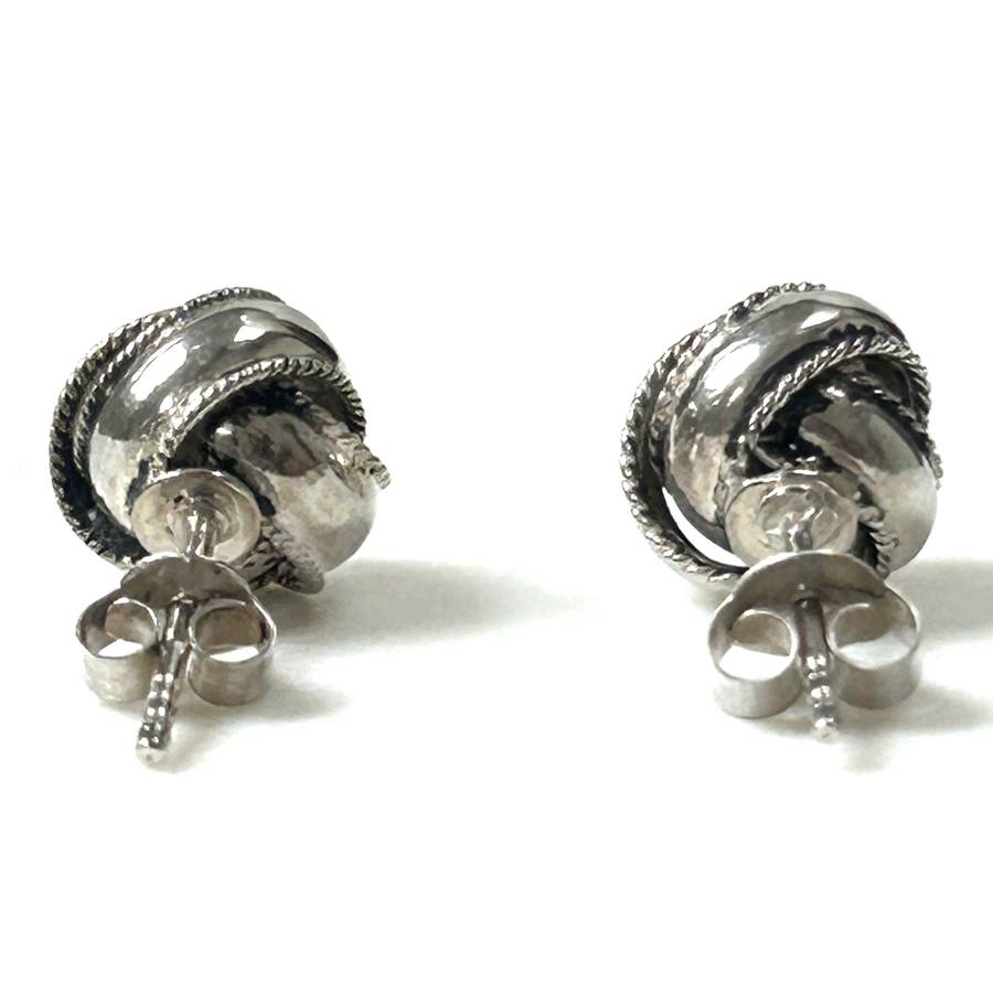 The small, silver stud earrings are in the shape of knots and have pins and butterflies. The butterflies are marked "925".