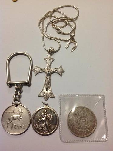 Pure silver cross with necklace, large Saint Christopher, 1924 silver half crown and 1966 silver one rand key chain