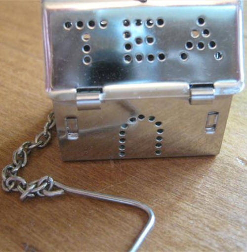 SILVER METAL, LOOSE TEA LEAF CONTAINER, SHAPED AS A HOUSE WITH A CHAIN .