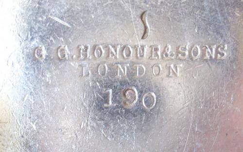 Made in England by G.G. Honour & Sons London number 190. There is a fine engraving with a number 37621. On the side of the jug is another stamp that says Stewart Neave & Sons Ltd. Size of the jug 107mm high