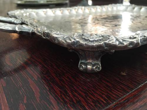 lovely  silverplate tray. very heavy ,58 cm long  including handles x 35 cm wide. Plating good . lots of detail standing on detailed scroll feet.