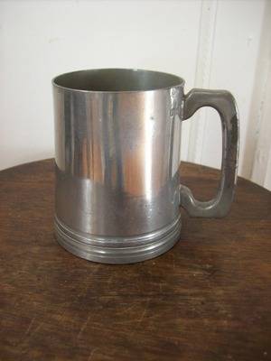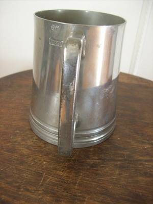 Silver plated beer mug, in good condition apart from some wear on the handle as shown.It is marked on the side "pint" and underneath Cashell & Chambers Birmingham made in England. Looks super with a bunch of flowers.