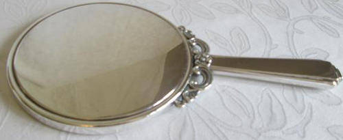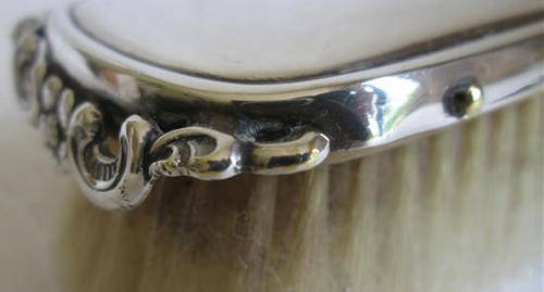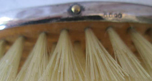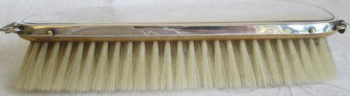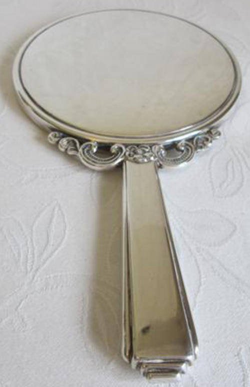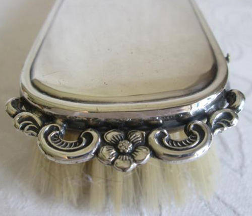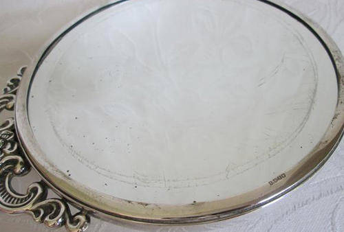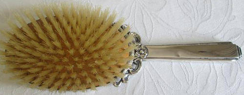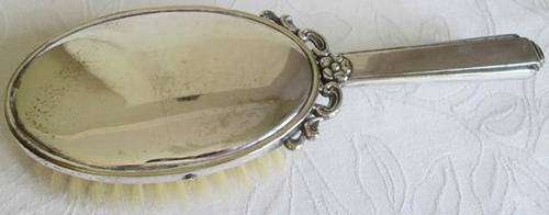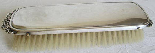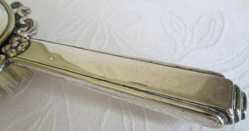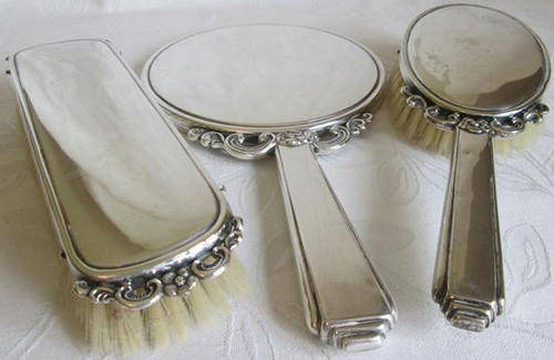 A VERY PRETTY VINTAGE SILVER PLATED, THREE PIECE DRESSING TABLE SET COMPRISING OF A HAND MIRROR, CLOTHES BRUSH AND A HAIR BRUSH. THE PLATING ON THE HAND HELD MIRROR IS IN GOOD CONDITION, THE BEVELLED MIRROR DOES HAVE MANY FINE SCRATCHES TO IT AND ONE SMALL CHIP TO THE GLASS AT THE TOP OF THE MIRROR IN THE BEVELLED PART. THE CLOTHES BRUSH IS IN GOOD CONDITION BUT DOES HAVE ONE END BENT DOWNWARD, I AM SURE THIS COULD BE STRAIGHTENED. THE HAIR BRUSH HAS SOME WEAR TO THE PLATING MOSTLY ON THE ONE SIDE, NOT ENOUGH TO SPOIL THE LOOK AND THERE ARE TWO TINY DINGS TO THE HANDLE, ONE ON EITHER SIDE.