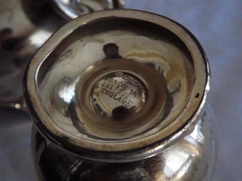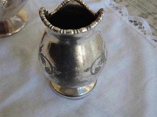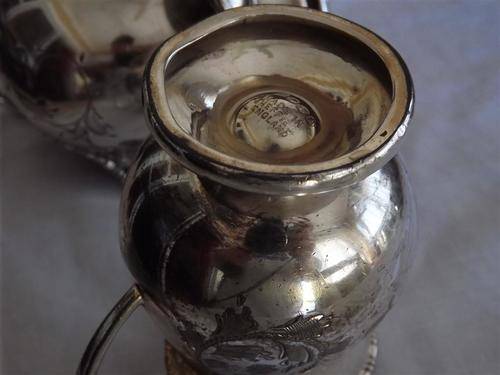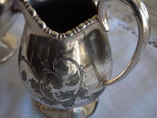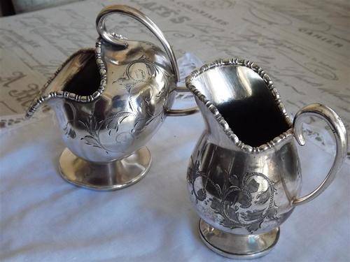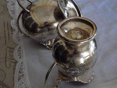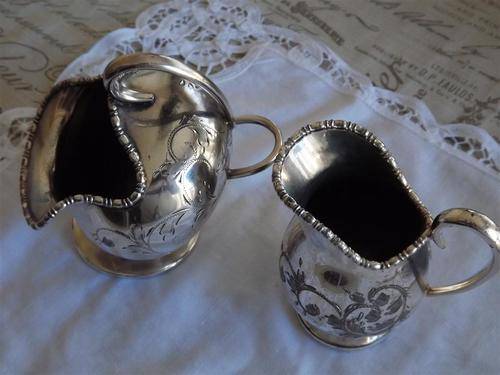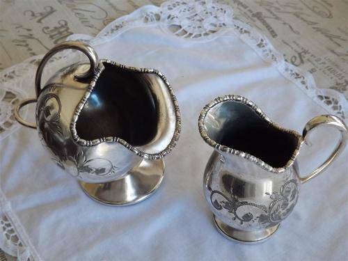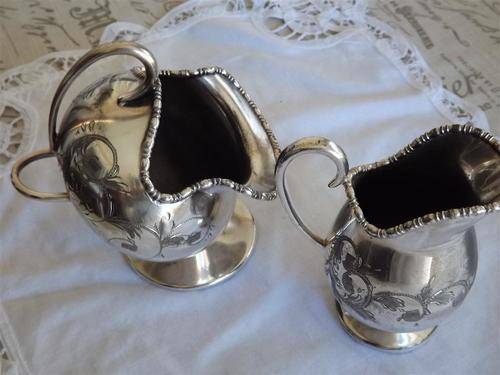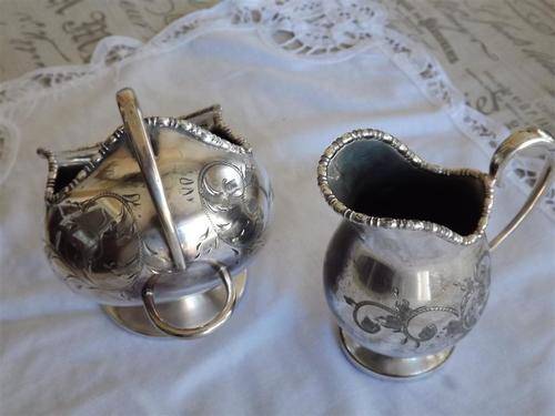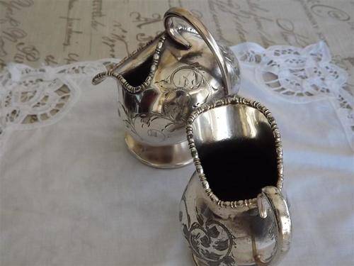 ON OFFER I HAVE ONE SILVER PLATED E.P.N.S. ORNATE VICTORIAN ENGRAVED SUGAR SCUTTLE / HELMET AND MATCHING MILK JUG SET. IT IS IN GOOD CONDITION FOR ITS AGE, EXCEPT FOR SOME SILVER PLATE RUBBING AND THE SUGAR HELMET BOWL HAS MOST PROBABLY BEEN DROPPED AND IT IS A LITTLE BENT ON THE BOTTOM STANDING , BUT IT IS HARDLY NOTICEABLE AND IT STILL STANDS STRAIGHT UP. PLEASE REFER TO ALL THE PHOTOS. PERFECT FOR THE SHABBY CHIC LOOK