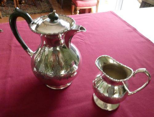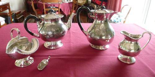 An attractive four piece teas set by John Turtons and Co of good size and with lovely decorative chasing - marked EPBM. It also his un unusual sugar scuttle with scoop, rather than the conventional sugar bowl. The hot water jug measures 21cm high and 19cn handle to spout, the teapot 19cm high and 24cm handle to spout. The plating on the milk jug and sugar bowl is good, but there is some wear to the plating on both pots. The finials of both pots stand at slight angles, which a competent silversmith should be able to straighten, and hinges and handles in good condition.