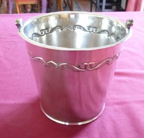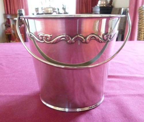 A silver plated ice bucket with art nouveau inspired decoration and swing handle. The ice bucket measures 15cm in diameter and stands 13.5cm high. The plating is in very good condition. A few minor marks inside do not detract.