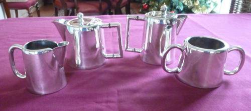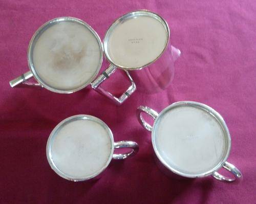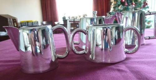 A silver plated railways four-piece tea set with two teapots 14cm handle to spout and 11cm high, plus a milk jug 11cm handle to spout and 8cm high and sugar bowl 14cm handle to handle and 7cm high. Plating is good.