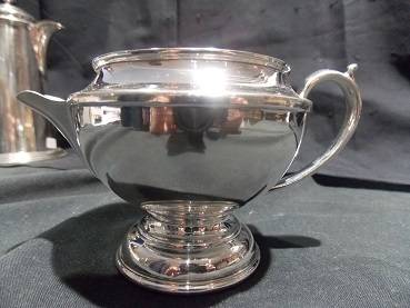 Here is a lovely four piece silver plated tea and coffee set. There is a coffee pot, tea pot, milk jug and sugar bowl. The handles and knob of the tea pot is bakelite and in very good condition. This set is elegant in its simplicity. The plating is in good condition.