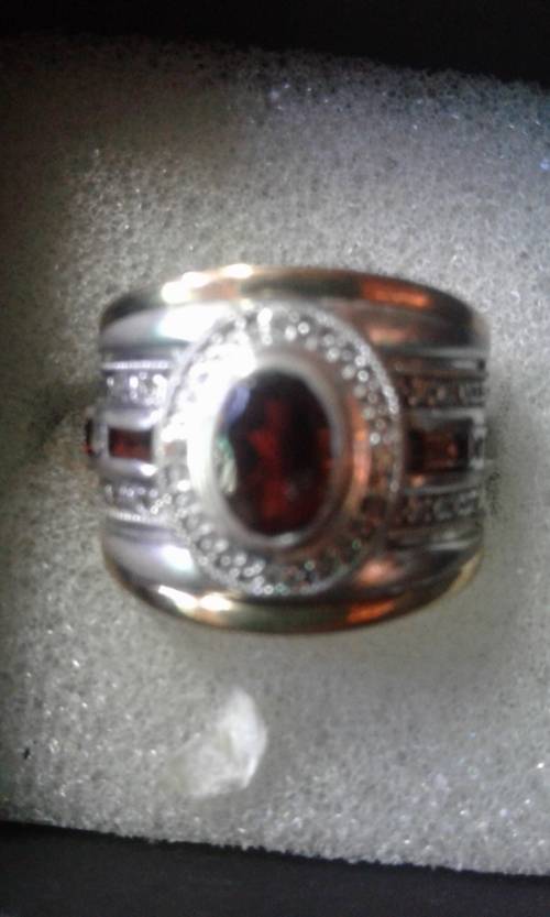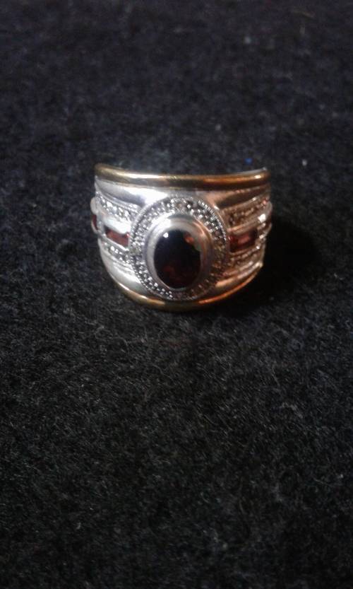 MIDDLE STONE IS RED WITH WHITE SMALLER AND 2 RED STONES I AM NOT SURE IF IT IS GENUINE STONES PLEASE SEE PICTURES