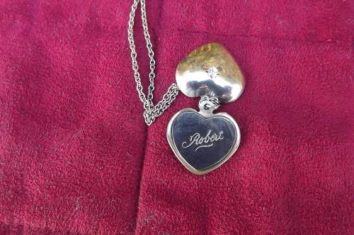 Silver toned chain wih heart shaped pendant.See scans for detail.New condition