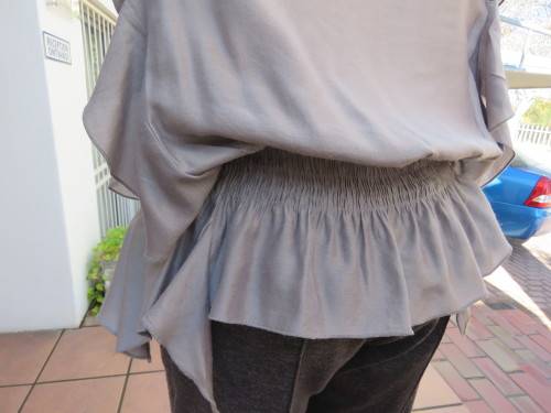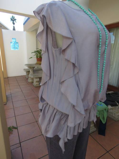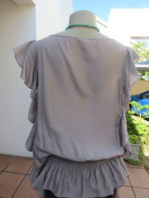 Silvergrey sleeveless maternity top by 'BABY ON BOARD' in size 34/10. Blouson top wide elasticated.High rounded neckline.Frills at both sides.In glimmer polyester/rayon fabric.Frilled high/low frill seam.Good cond.