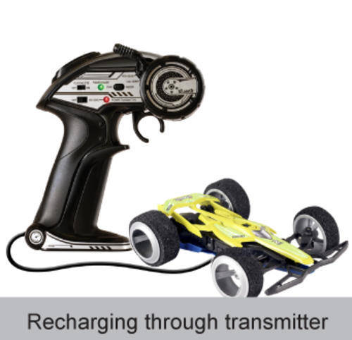 Why is it Special- The 3D Twister has all sorts of things that make it special. They claim to be the first 2.4Ghz RC Vehicle. We assume they mean in the ‘toy market’ because in the hobby 2.4 has been around for years. But it’s still a good jump for the toy stuff! No more 27 mhz or 47 mhz stuff. It has bump feedback in the controller! When we were testing, I never told anyone about it.. then they would hit something and be amazed! While you may think this sounds cheezy, it’s pretty cool. It’s just like having rumble on your game controller. When it lands upside down, all the controls automatically flip. For example.. if you were turning left driving forward, and you hit a ramp and flipped, when you landed you would still be driving forward and turning left. If you did this with a normal RC vehicle, you would be driving backward and turning right. You can hold the car in your hand, and flip it, and watch the motor and the steering change right before your eyes. This was great for indoor bashing.. no getting up off the couch to flip it over after an insane jump and bad landing. You just keep driving. It has a lipo battery! At the time of writing this, I don’t know any other toy grade RC vehicles coming with lipo’s!