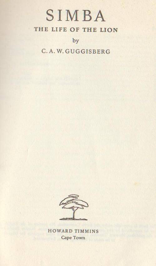 Simba The Life Of The Lion By C A W Guggisberg, published in 1961, 304 pages, hardcover with no dustjacket, scuffing etc, also please see marks/stains on front cover and note that there is another stain on the back outer cover as well (water stain), also age spots on some pages however all pages are intact and are quite readable.