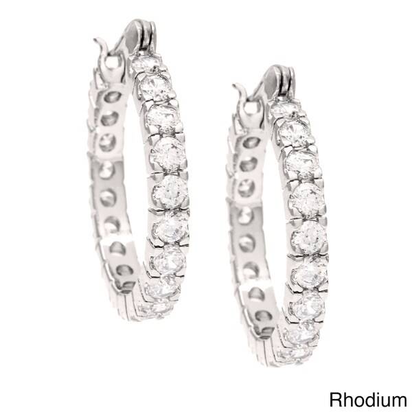 Round-cut clear cubic zirconia stones sparkle all along the outer edges of these hoop earrings by Simon Frank. Available in your choice of rhodium-plated or white goldplated brass options; these earrings are finished with saddleback clasps.