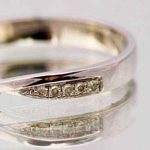 This elegant piece is beautifully crafted in 9ct white gold. The slender polished shank has a twisted feature on the ring head, with the bottom part of the one side of the twist bearing a row of 10 x small, round faceted diamonds claws set in an indented channel that starts on the shoulder of the piece. The mirror image occurs on the other side of the twist. The centre of the twist is narrow and delicate. The pedigree of the 2,5 gram piece is evident in the many hallmarks - the 375 hallmark indicating 9ct gold, the jeweller's signature, the date hallmark for 2016, and the Sheffield Assay mark. The piece also bears the 'DIA' hallmark indicating authenticated diamonds. The piece would make a beautiful wedding band; it is in excellent vintage condition with not even buff marks to speak of its age.
