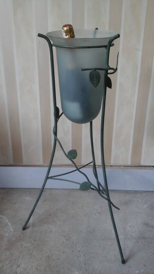 SIMPLY EXQUISITE FROSTED GLASS ICE BUCKET AND WROUGHT IRON STAND.